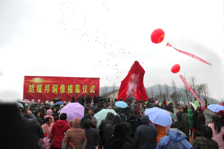 來自全國墾荒隊員、普通群眾及美術(shù)界人士自發(fā)冒雨參加胡耀邦巨像揭幕式