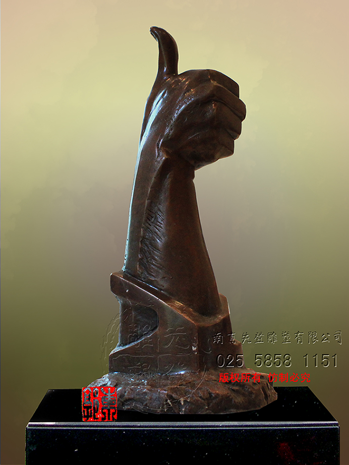 若要用一個詞來形容眼前的雕塑,莫過于“芝華士”了,沿用克里斯汀·拉科魯瓦對芝華士的評價“在我看來,有些名字,哪怕只是聽人提起或在書中偶遇,就會不自覺地將其與'聲名顯赫'聯(lián)系起來,因為這些名字本身就代表著一種品質、一種權威或者一種奢華氣質。對我而言,'芝華士'這三個字就是'時尚'、'奢華'、'尊貴'的代名詞。”一種酒何以用“奢侈”、“最貴”、“時尚”來形容?路人皆知,喝芝華士是一種享受,將酒提升為藝術,由內而外的品鑒,是一種邊緣文化潮流化,這一切不僅源于調酒師Colin Scott以及精湛絕倫的技術,而且他擁有世界頂級設計師克里斯汀·拉科魯瓦、亞歷山大•麥克奎恩。然而一尊雕塑,何以用一種酒來代稱?其實不然,芝華士的定義早已并非一樽酒而已,芝華士,享有世界蘇格蘭高級威士忌,他是外在與內在的統(tǒng)一,誠如雕塑所塑造的舉起的大拇指,同等的是一種邊緣文化,她需要人們鑒賞品位,需要足夠的情趣與審美素質。如同芝華士所代表的“時尚”“豪華”“尊貴”,雕塑依然具有最豪華的陣容,華麗端莊的金箔,剛毅的輪廓,以及人類機理特征所表現(xiàn)的自然之美,他是藝術家獨具匠心的杰作,是一樽東方的皇室威士忌,享有與芝華士同樣的尊榮。用它來界定雕塑,而且是眼前獨具匠心的雕塑,是源于其洗凈鉛華般的唯美設計風格以及其醇和出眾的口感,如雕塑從內而外,周身所散發(fā)出的氣質。